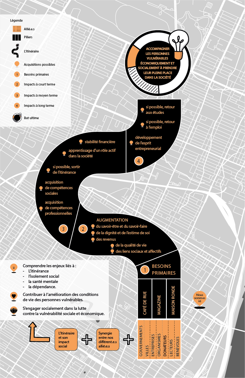 L’Itinéraire offre de nombreux programmes de réinsertion et de formation, divers services et des accompagnements adaptés à la réalité et aux besoins des camelots et des participant.e.s.